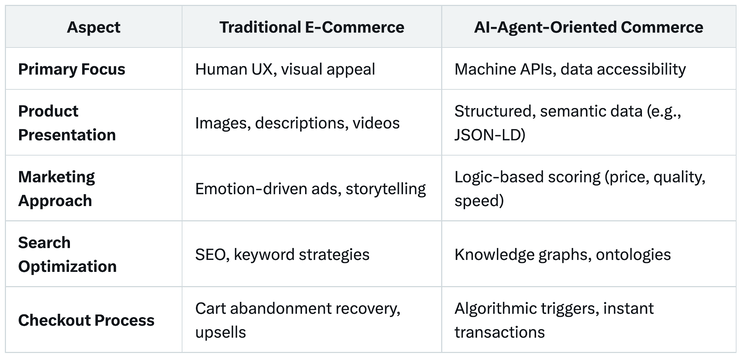 Here’s a comparison of traditional e-commerce versus AI-agent-oriented commerce: