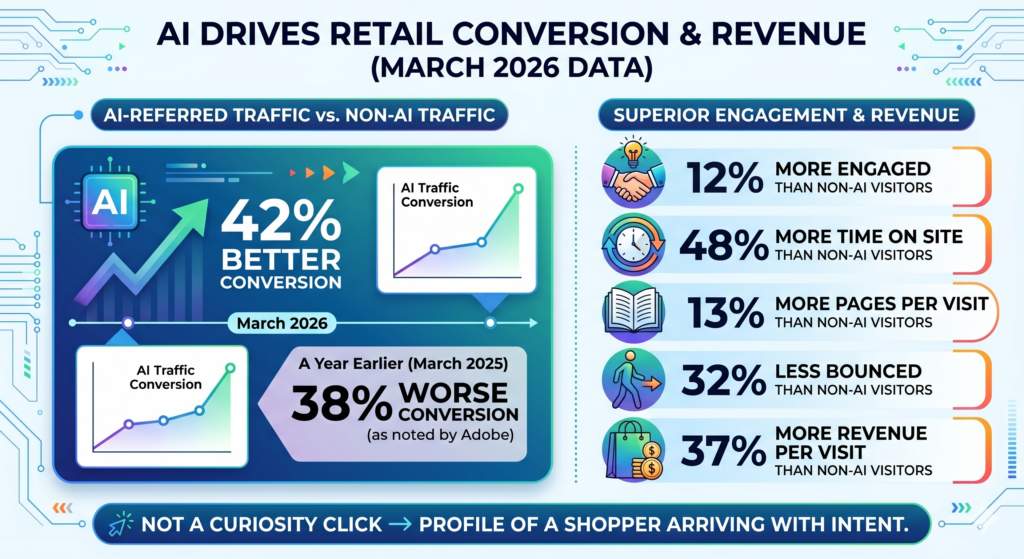 In March 2026, AI-referred retail traffic converted 42% better than non-AI traffic. A year earlier, Adobe says it converted 38% worse. AI-referred visitors were also 12% more engaged, spent 48% more time on site, viewed 13% more pages per visit, bounced 32% less, and generated 37% more revenue per visit than non-AI visitors. That is not the profile of a curiosity click. It is the profile of a shopper arriving with intent.